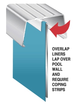 Overlap Above Ground Swimming Pool Liners: Overlap above ground swimming pool liners are the most economical option and are easy to install. They attach to the pool kit wall with coping strips that hold the liner to the pool wall. A coping strip is a piece of plastic that acts like a wide paper clip that runs along the top of your above ground pool kit wall. Since it “overlaps” the swimming pool wall from the inside, the pool coping strip ensures that the liner is held firmly in place. Multiple coping strips are used to precisely contour the entire length of the pool wall. Because overlapping may cause unevenness when installing, Overlap designs are typically limited to a solid color or uniform patterns. Many attractive styles are available and add a hint of style to a pool.