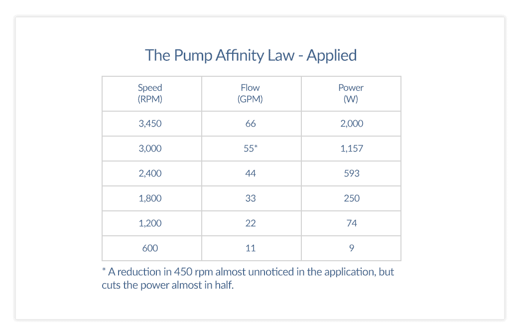 However, because of the Pump Affinity Law, slower flow rates create greater energy savings. In the field, a variable speed pump set at a flow rate of 22 gpm will draw 116 watts and turn the pool over in 19 hours but only consume 2.2 kWh of electricity.