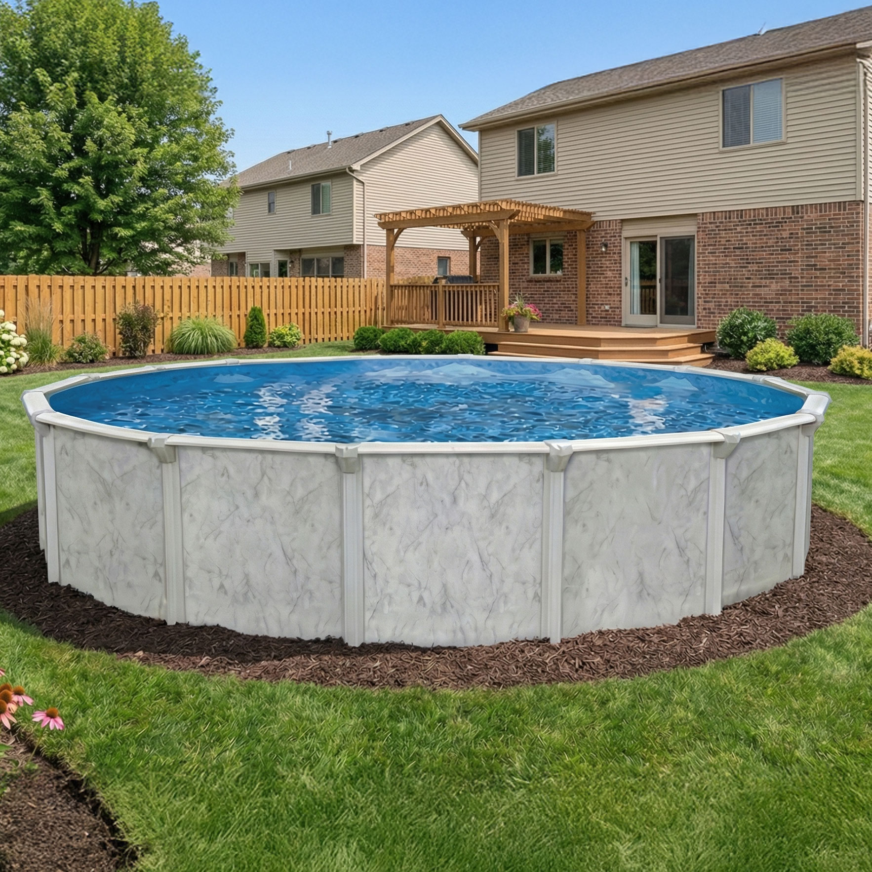 A 24′ Round 52″ Deep Sterling Above Ground Pool Kit provides the strength of steel verticals and steel top rails – the perfect match for your backyard. Sterling pool walls are hot-dipped galvanized copper bearing steel in a soft elegant Sterling pattern.