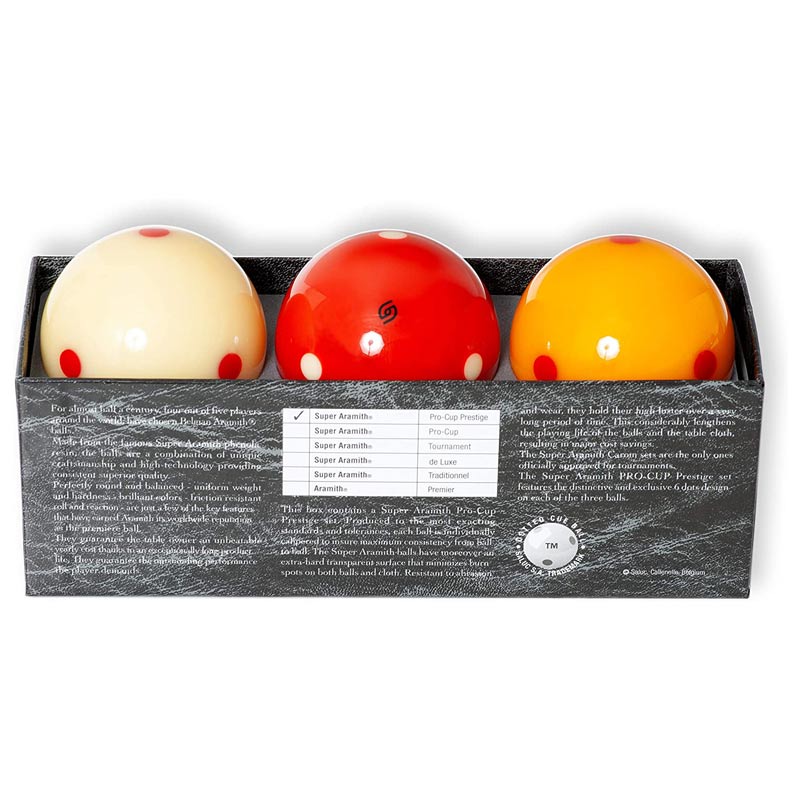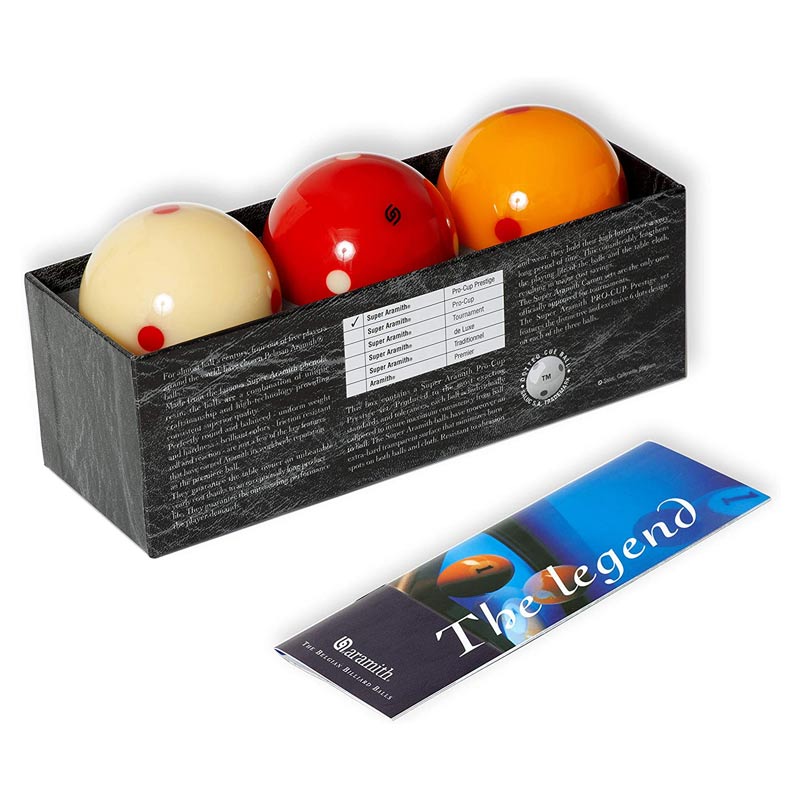 The Super Aramith balls have moreover an extra-hard transparent surface that minimizes burn spots on both balls and cloth. Resistant to abrasion and wear, they hold their high luster over a very long period of time. This consistently lengthens the playing life of the balls and the table cloth, resulting in major cost savings