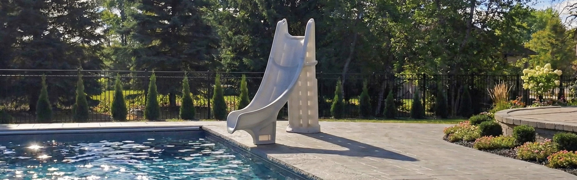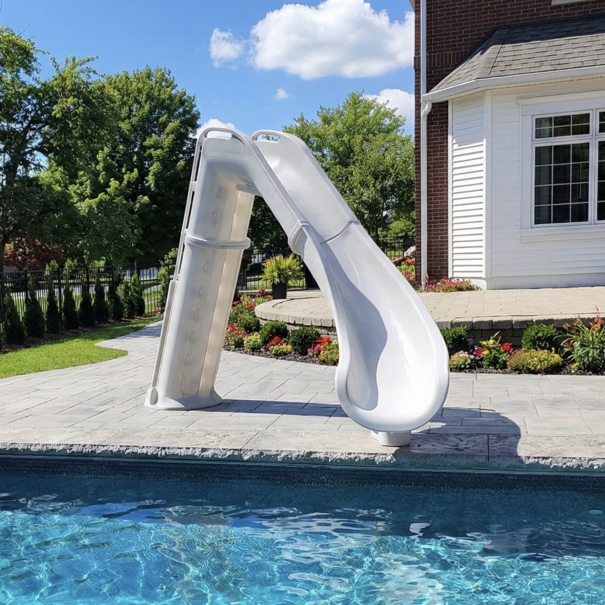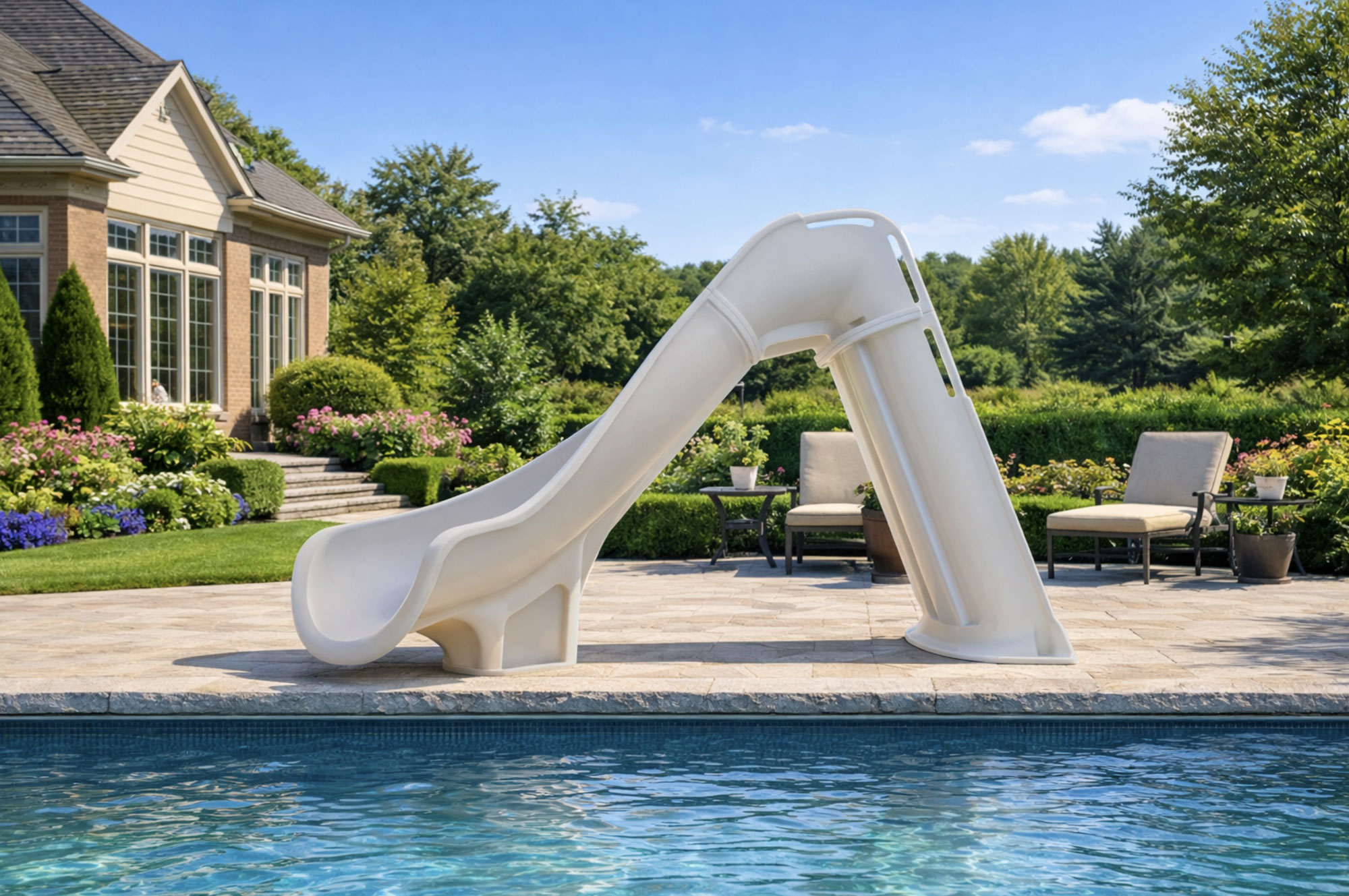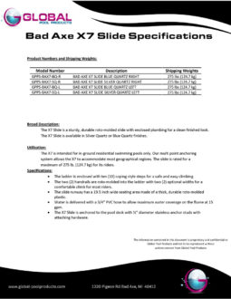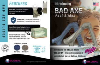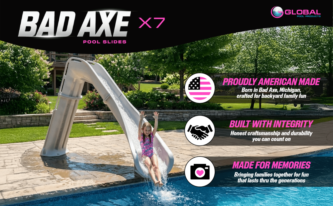 The Global Pool Products Bad Axe Swimming Pool Slide is a high-end pool feature created to enhance both the look and enjoyment of residential in-ground pools. With an overall height of 7’4” and a smooth slide path, it offers a wide flume and an exhilarating ride that feels fast yet controlled.