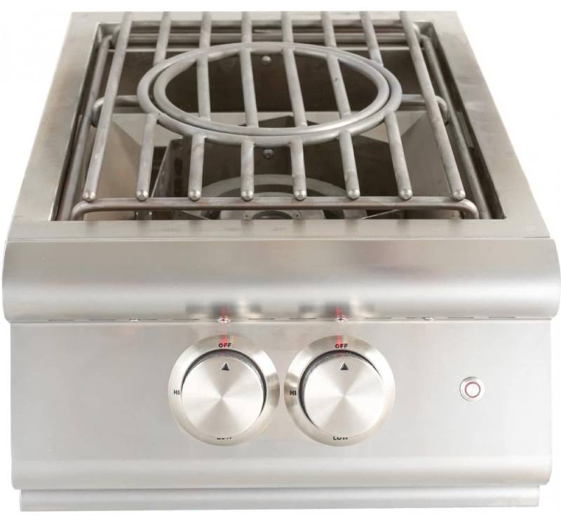 The Blaze Premium LTE Built-In Natural Gas High Performance Power Burner W/ Wok Ring & Stainless Steel BLZ-PBLTE-NG. Power Burners. Introducing an affordable power burner that incorporates a narrow footprint and an efficient design which boils water in half the time as other power burners on the market. At 15 3/4 inches wide, the Blaze Premium LTE Power Burner gives you more room for additional components or more counter space for prepping and other tasks. Blaze power burners are made from stainless steel and include a removable stainless steel lid to protect the burner when not in use. The cooking grid is constructed from heavy-duty stainless steel rods with a removable 9-inch inner ring for cooking with a wok. Underneath the grid, a stainless steel guard surrounds the burner, which protects it from the wind and concentrates heat for maximum efficiency. This natural gas power burner features two, individually controllable burner rings. The inner ring is rated for 25,000 BTUs, and the outer ring is rated for 35,000 BTUs. The burners are lit with a simple push and turn ignition. This dual ring design is ideal for cooking versatility. The inner burner is great for simmering sauces, or use both burners when boiling shrimp or frying fish. Cooking with the outer ring is perfect for large skillets and pans, as the high heat allows the pan to heat up quickly. The burner ring is made from commercial quality, 304 cast stainless steel for longevity. This power burner also sports red LED control knob illumination for cooking and entertaining at night. If you are looking for an affordable power burner so you have more in your budget for other components, Blaze power burners are a great solution. A power transformer is included for the lights.