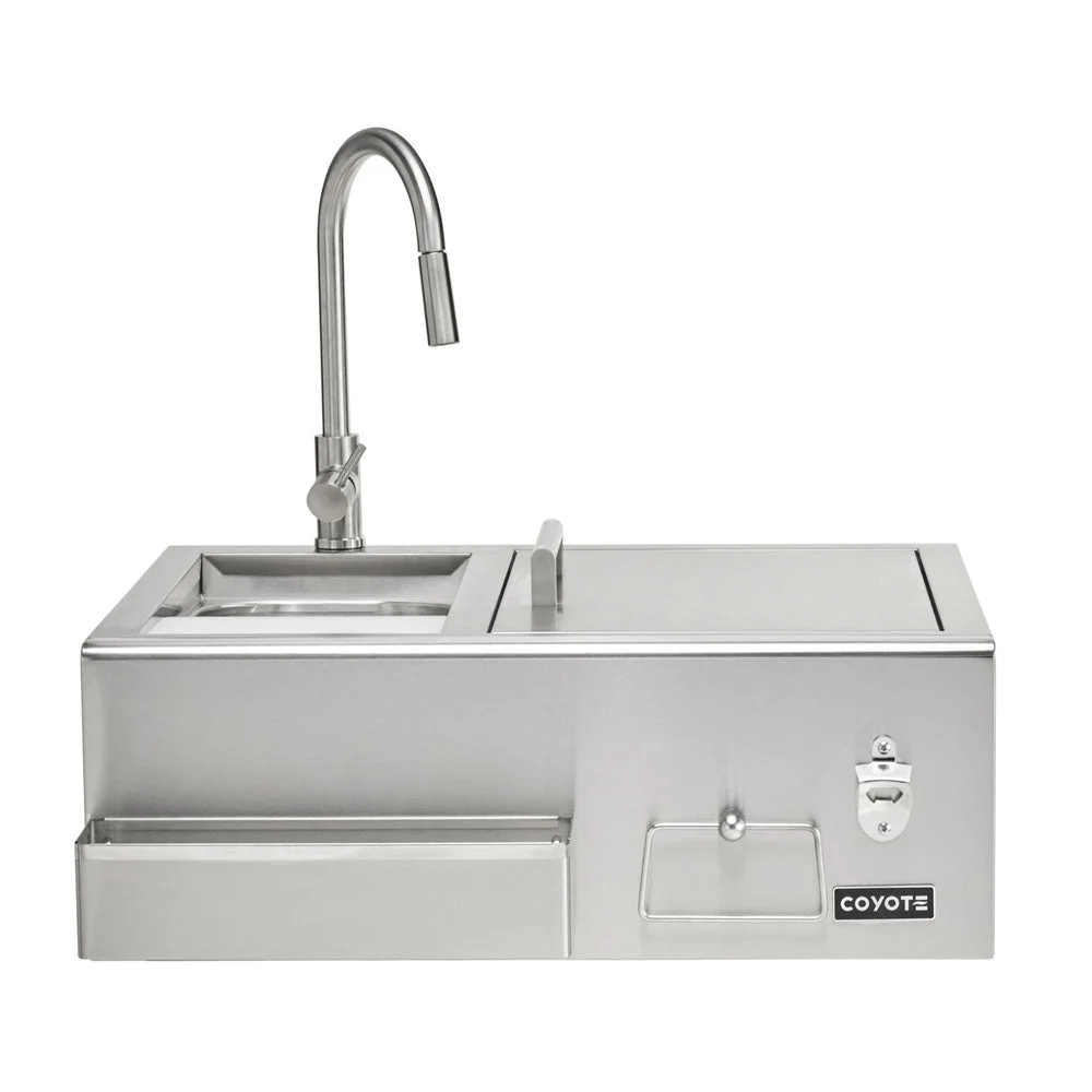 The Coyote 30″ Built-In Refreshment Center has a drop-in cooler with drain and a removable condiment tray insert. The beverage center also features a convenient bottle shelf, towel holder and a bottle opener. This refreshment center will allow you to customize your kitchen to enhance your outdoor living style. This refreshment center is made of premium stainless steel material which is sure to last you a very long time. This refreshment center includes a drop-in cooler with drain. A Condiment tray insert for the drop-in cooler is also included. There is a convenient shelf in front of the sink. Rigid construction ensures strength and durability.