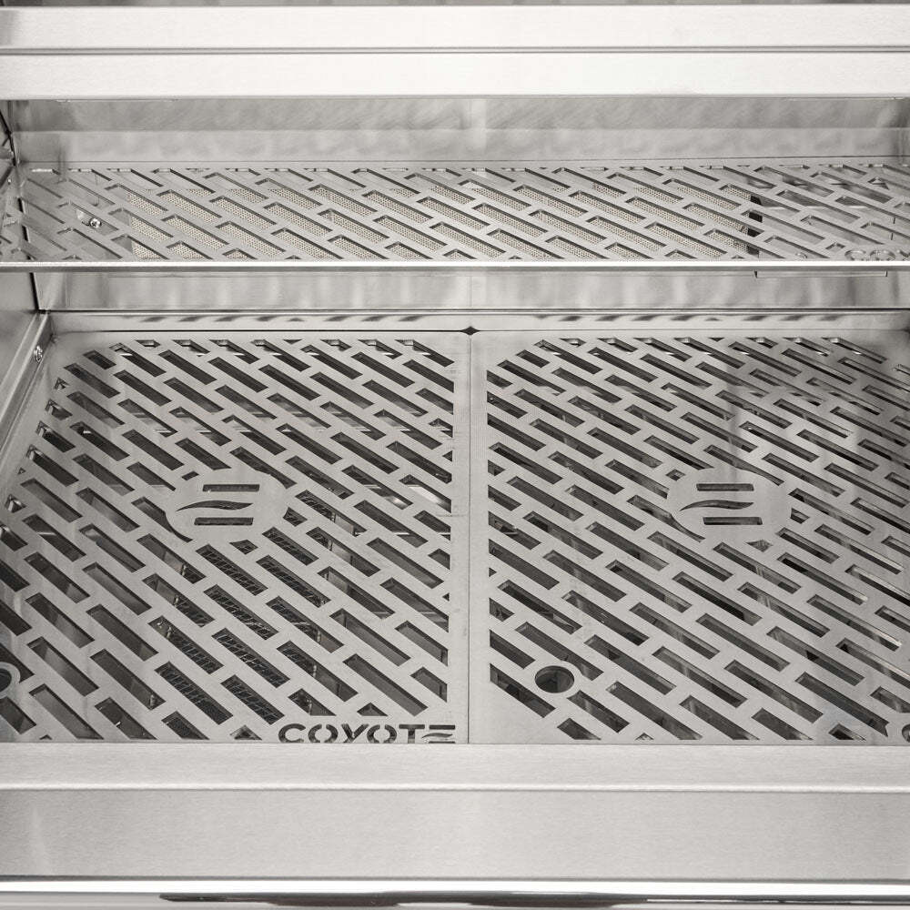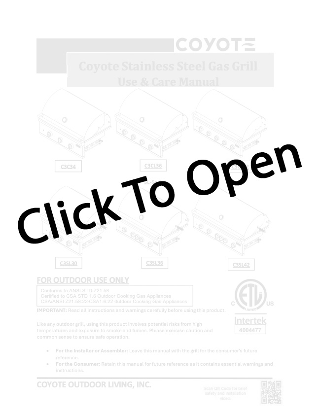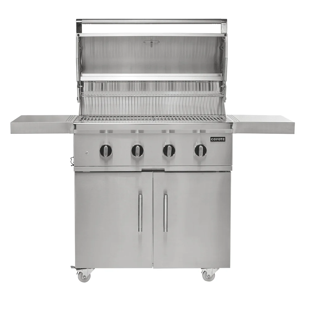 The Coyote SL-Series 36″ 4-Burner Freestanding Gas Grill combines all the power and function of a luxury grill with the durability of a Coyote grill. This 36″ freestanding gas grill features 18 gauge 304-grade stainless steel construction with a double-walled canopy and continuously hand-welded grill box with seamless edges. This gas grill offers performance-enhancing ceramic briquette trays that minimize flare-ups and distribute heat evenly across the 640 square inch cooking area.