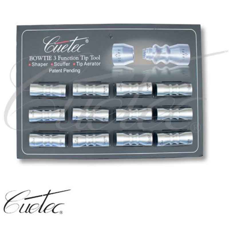 CueTec Bowtie Tip Tool – Card of 12. Cuetec Cues burst onto the scene in 1989 as a new concept in billiard cues. The basic premise being a cue, using a patented process, with a Grade A Plus North American Maple shaft coated with a thin layer of fiberglass or graphite that stayed straight despite all adverse conditions, was extremely damage resistant against the rigors of all types of play, was easy to maintain, and most importantly offered true professional quality and playability at prices just about anyone could afford.