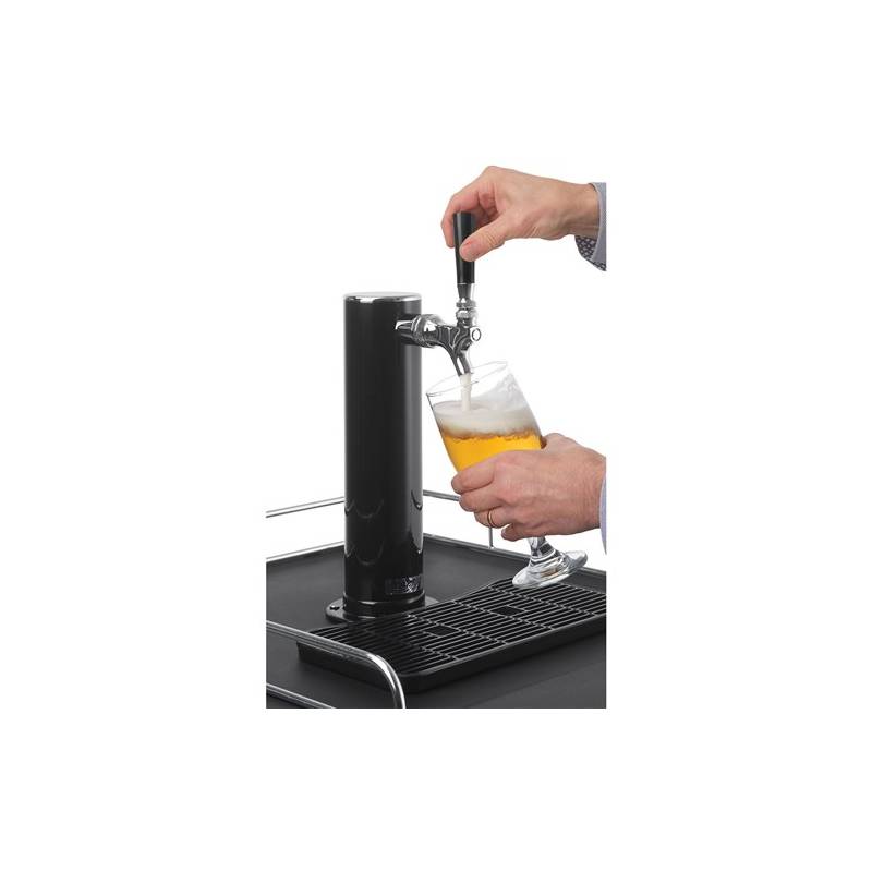 - Single-tap black beer tower dispenser with removable drip tray