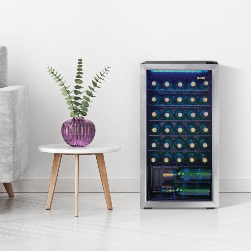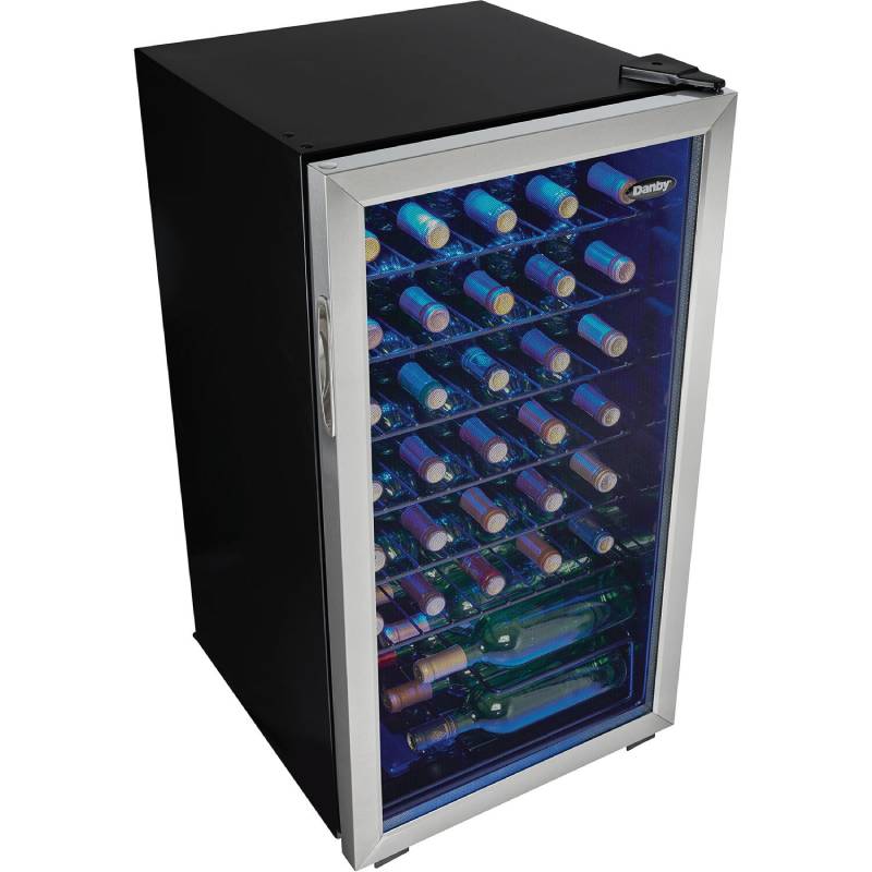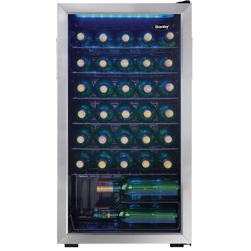 The Danby DWC036A1BSSDB-6 Black 3.3 CuFt. Single Zone Bottle Wine Cooler When you have several bottles of wine that need to be cooled, the most convenient and economical way to store them is in a fashionable free-standing wine cooler such as this model from Danby. This spacious unit offers 3.3 cubic feet of cooling space which is designed to store up to 36 bottles of your favorite wines on attractive black wire shelving units.