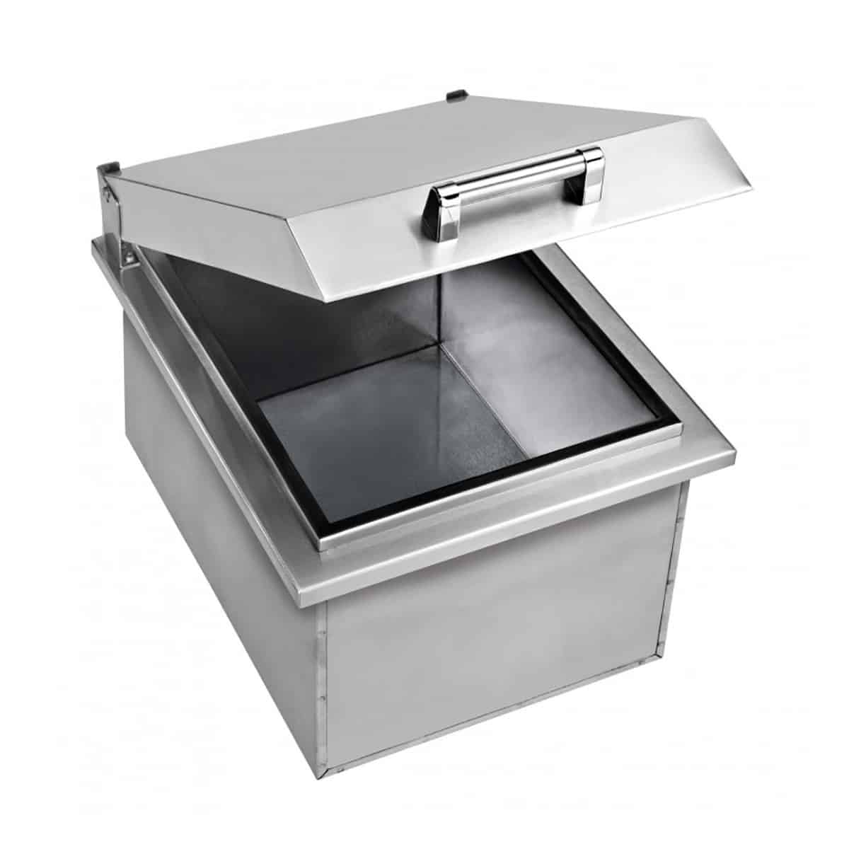 The Delta Heat 20″ x 15″ Drop-In Cooler provides a high-end built-in countertop cooler, a terrific addition to your custom grill island. The fully insulated and gasket-sealed lid help keep items cold for hours and can be removed if you want to use the cooler without the top. This ice bin features a 10-inch deep basin and brass drain with plug. This ice bin is a great addition to your Delta Heat outdoor kitchen. This unit features a 20″ depth for increased capacity, a brass drain with a plug, heavy duty hinges, and an insulated removable lid with a gasket seal to keep contents cold.