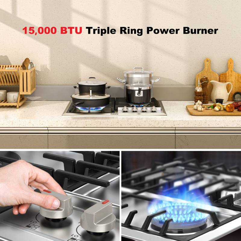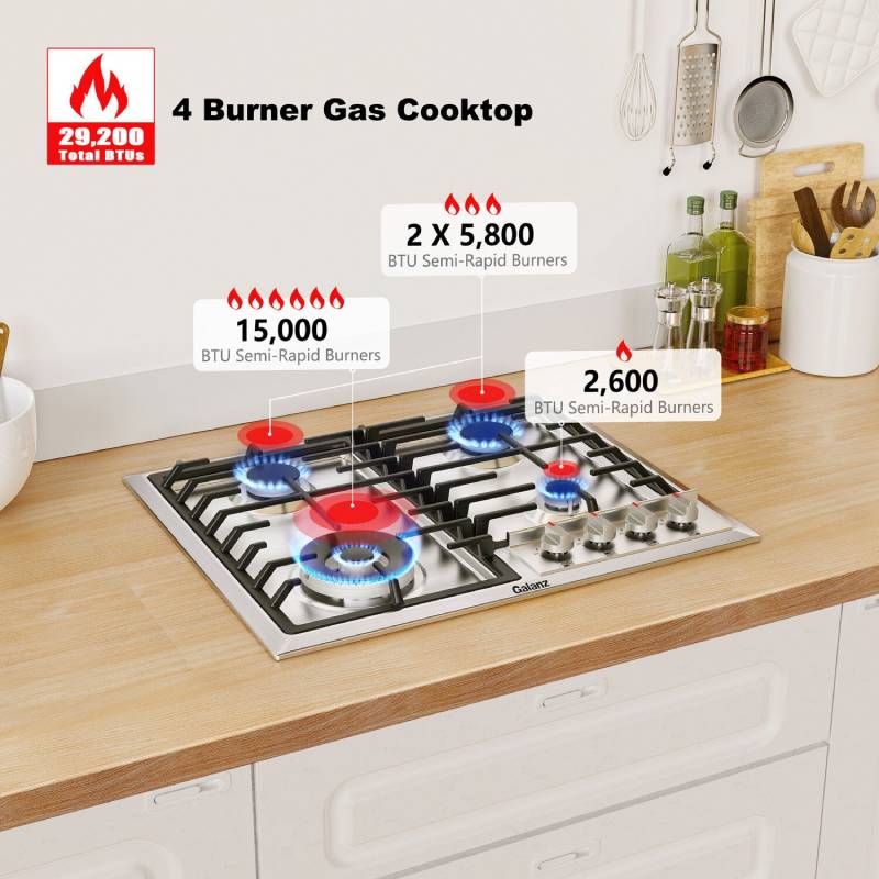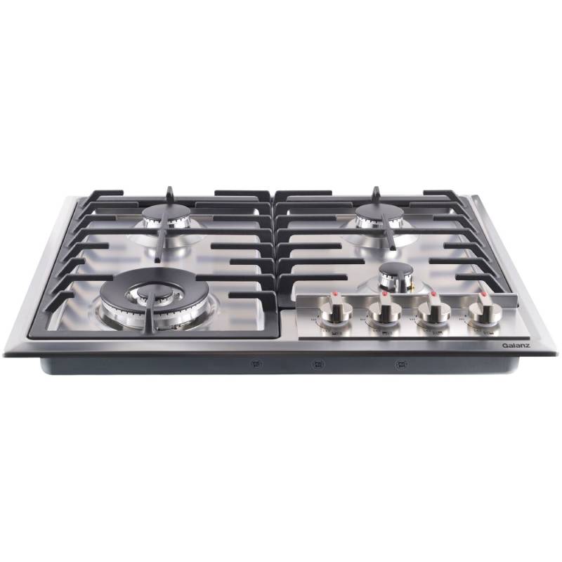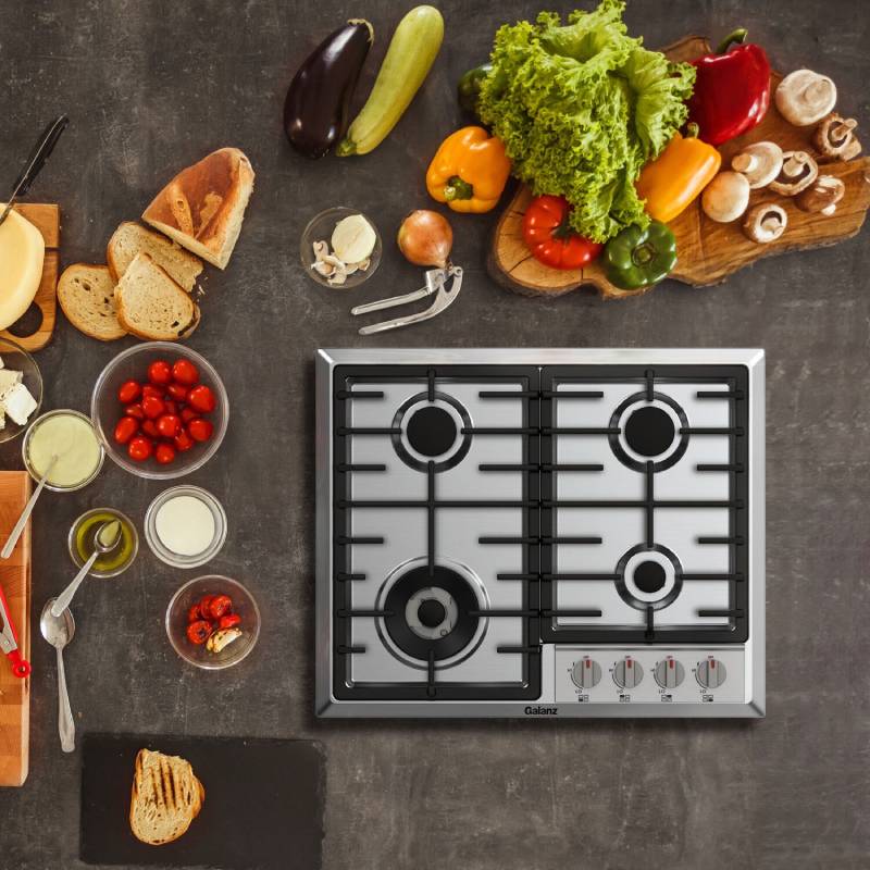 The Galanz 24-inch gas cook-top provides a compact design without jeopardizing innovative features, sleek design, and great performance. Easily accommodate pans of all sizes, and prepare family-sized meals atop heavy-duty grates and four cooking elements. Cook on a low simmer, or turn up the heat with our powerful 15,000 BTU triple ring burner that is perfect for high-heat searing. Metal knob controls and a stainless steel surface give this Galanz gas cook-top the high-end finish that is the perfect match to any home kitchen.