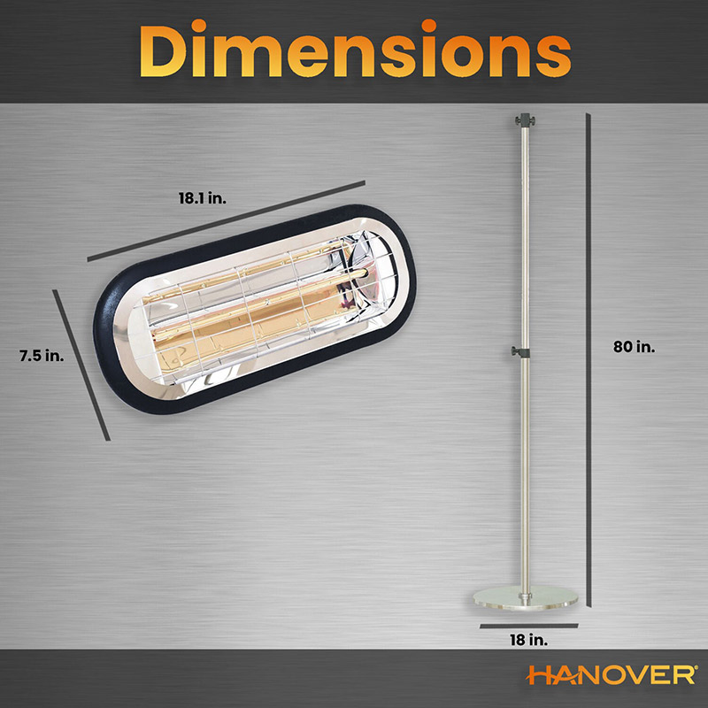 When choosing an outdoor heating system or garage heater, consider Hanover’s line of electric infrared heaters. The Hanover halogen infrared heat lamp is highly effective for hanging from the ceiling or mounting to a wall. Use for your patio, porch, balcony, garage, workshop, and more! The heater features two heat settings operated by a handy remote control, conveniently included with the heater. Easy to assemble, this model can be mounted to a wall, hung from the ceiling, or mounted onto the included stainless steel stand for seamless integration into your outdoor entertainment space. Similar to sunshine, infrared heat is a radiant heat that warms a person or an object directly rather than heating the air in-between. Infrared heat can be felt instantly as soon as you turn it on – no waiting for it to warm up. In addition, an outdoor infrared heater saves energy by using less power to create the same amount of heat as traditional gas heaters, and there is no smoke or fumes. Extend the use of your outdoor living space with a Hanover mountable infrared heater.