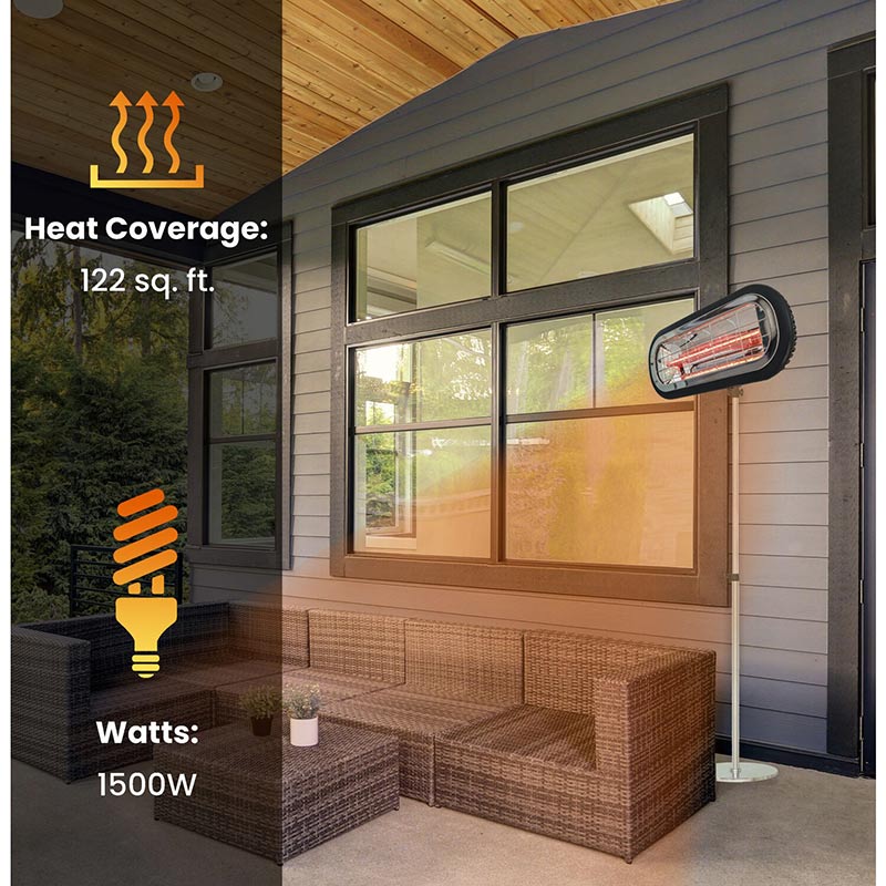 - POWERFUL EFFICIENT HEAT: This electric heater can transmit heat up to a 122 sq foot radius, perfect to stay comfortable on your patio, porch, balcony, garage or workshop.