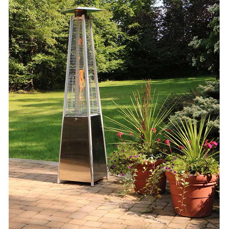 Hanover 7′ Tall, 42,000 BTU Stainless Steel Pyramid Flame Glass Propane Patio Heater with Cover Combo Features: