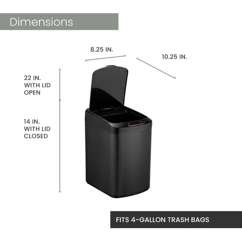 - This waste bin requires 4 “AA” batteries and measures at 9.5 in L x 9.5 in. W x 14.2 in H. The perfect bathroom trash bin for any household.