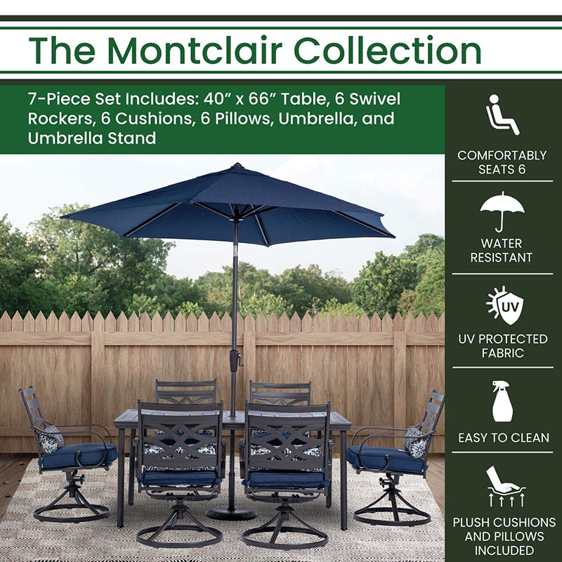 Spend more time outdoors with the Montclair 7-piece patio set from Hanover. This outdoor dining set includes six swivel rockers, 40-in x 66-in. dining table and 9-ft. umbrella. The sleek, modern frames are forged out of heavy-duty steel and treated with a multi-step finish for the ultimate outdoor protection. Items within the Montclair Collection are designed to be durable, functional, and timeless. Designer details include curved backrests, elegant curling arms, and swivel-action chair bases that can sweep guests off their feet into a full 360-degree spin. Each chair is topped with thick foam cushions and pillows that allow you to entertain your guests in fashionable comfort. The fabric is soft to the touch, yet durable enough to resist moisture, stains, and UV harm. You’ll also stay cool and comfortable under the sun thanks to the coordinating table umbrella featuring an easy open/close crank and a tilt function so you can adjust the shade. Entertain in style and comfort all year long with the Montclair Collection.