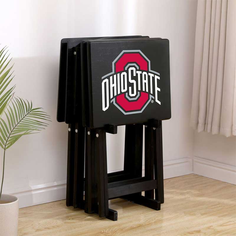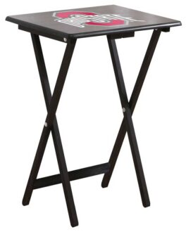 Show your team spirit with the Officially Licensed Collegiate TV Snack Tray Set. The heavy duty trays and storage rack are made from select hardwoods that are finished with a durable, easy to clean surface so you don’t have to worry about stains. Team logos are silkscreened on the top of each tray. When you are done snacking, put the trays back into the storage rack to keep things neat and clean. Each tray measures 26″L x 19″W x 14.5″H. Set of 4 snack trays and storage rack are made to order. Made in China.
