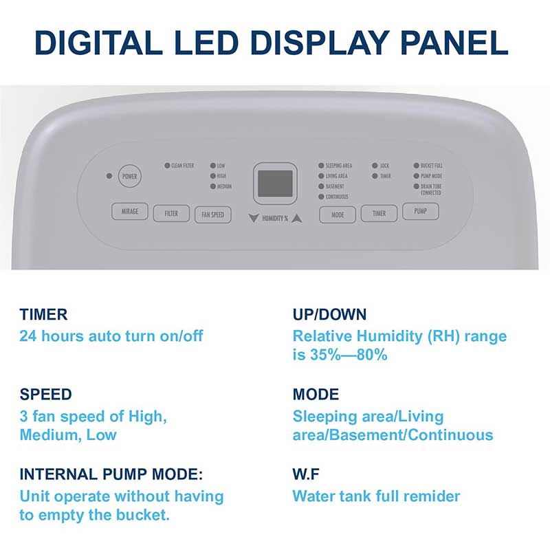 The JHS dehumidifier removes 50 pints of moisture form the air per day. Removing damp air from your indoor space, this unit works to provide a pleasant living experience. The perfect solution for bedrooms, attic, basement, and more. Electronic controls with 3 adjustable speeds means you can set your level of comfort with ease. And following a power outage, the unit saves your settings and auto-restarts your dehumidifier when power is restored. Removable, easy cleaning dust filter: Designed with a removable filter with a clean-filter alert, the unit prioritizes convenience by providing a simple process. Continuous draining with built-in pump: connect your unit to a standard garden hose for continuous draining up and out window or into wash basin, with no emptying necessary. And with an easy-carry handle on an 16.9-pint bucket with a bucket full alarm, the unit is simple to empty when operating without continuous drainage.
