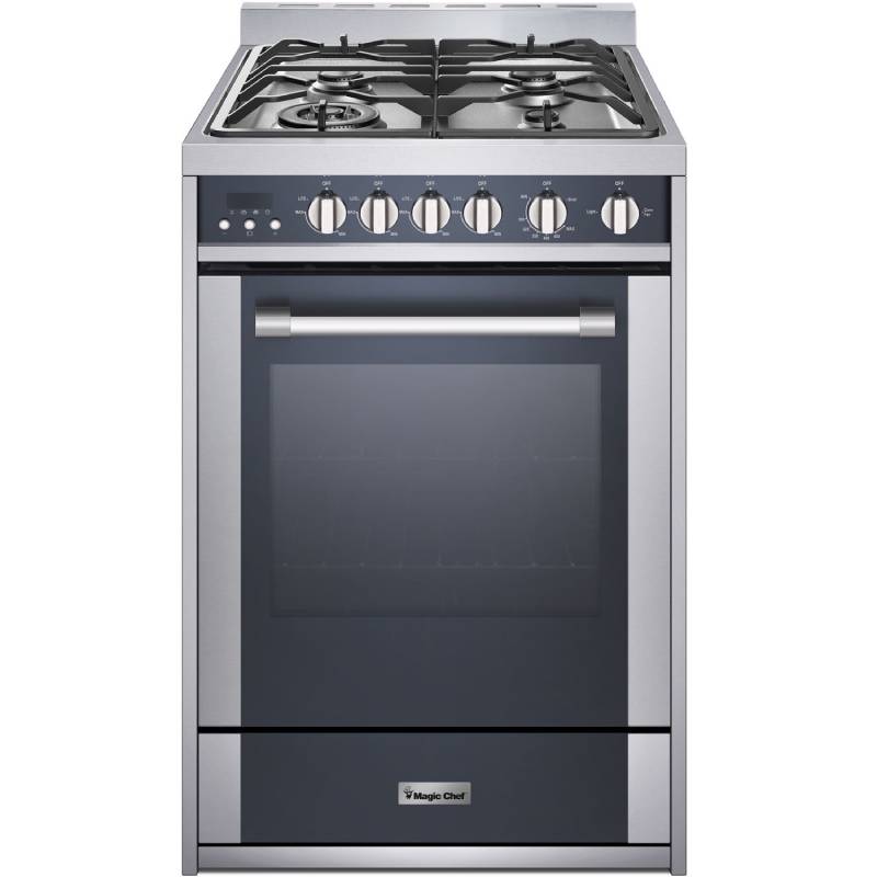 The Magic Chef 24-inch wide freestanding gas range is the perfect fit for smaller kitchens, yet lets you prepare family-size meals. The 2.7-cu. ft. capacity oven offers four cooking modes including Convection cooking. The stainless steel cooktop with cast iron grates feature four sealed brass burners with flame failure protection. Plus, the stainless steel exterior with a mirror glass finish looks stylish in any kitchen.