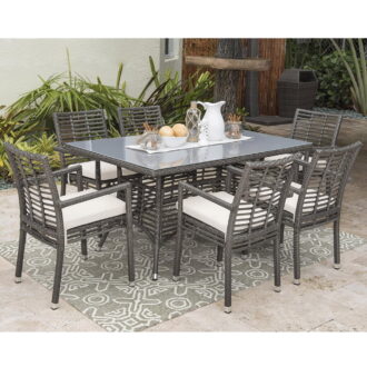 Panama Jack Outdoor Graphite 7 Pc Dining Set with Cushions is constructed from see-through grey fiber hand woven over aluminum frames, the Panama Jack Graphite collection will bring a sleek and modern look to your backyard or patio. Resistant to corrosion and scratching, this rectangular high coffee table is ideal for any outdoor living area and can be combined with many other items from the Graphite collection to create an outdoor living area perfectly suited to your needs. Additionally, the tempered glass is included with the table for stress-free completion of your hand-picked outdoor living area.