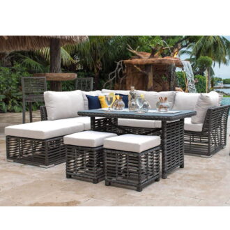 The Panama Jack Graphite 7 Pc. Sectional Set with High Coffee Table is constructed from see-through grey fiber hand woven over aluminum frames, the Panama Jack Graphite collection will bring a sleek and modern look to your backyard or patio. Resistant to corrosion and scratching, this sectional set is ideal for any outdoor living space and can be combined with many other items from the Graphite collection to create an outdoor living area perfectly suited to your needs. Cushions are included in an off-white outdoor polyester fabric or you can choose from one of our many Sunbrella outdoor fabric options. Additionally, the tempered glass is included with the rectangular high coffee table for stress free completion of your hand-picked outdoor living area.