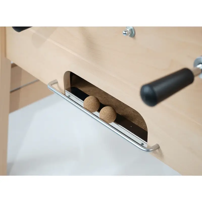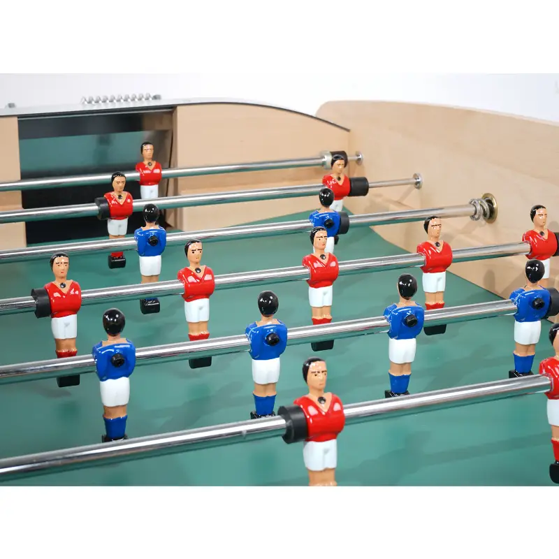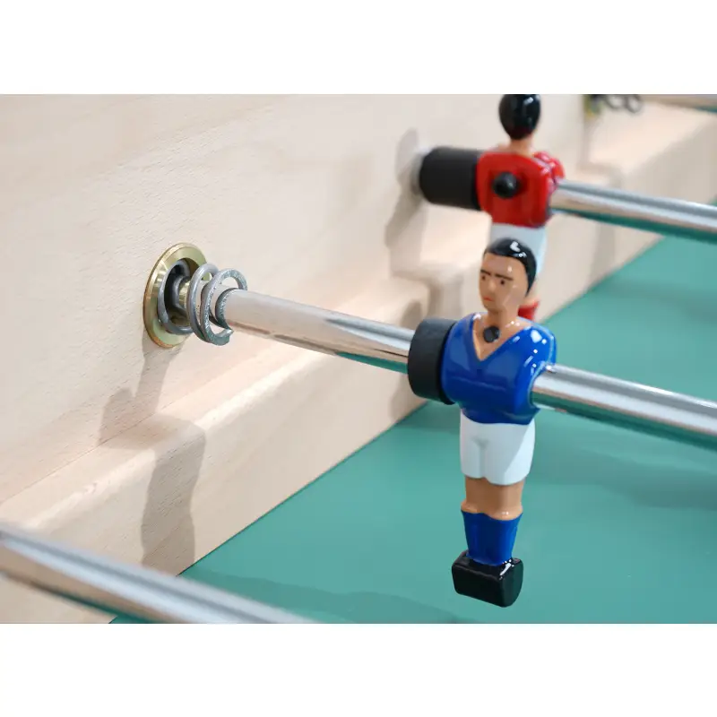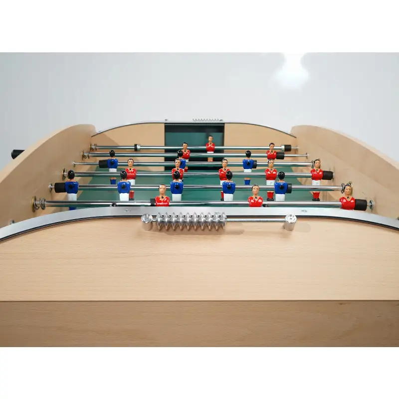 Beneath its elegant exterior, the Competition is engineered for consistency. A braced cabinet resists flex during fast rallies, while the high-precision playfield features sloped corners that keep the ball moving—eliminating dead zones and preserving flow. Telescopic rods (a hallmark of French tables) keep rod ends safely within the footprint during aggressive play, protecting bystanders, walls, and adjacent furniture. Low-friction bushings give the rods a smooth, linear stroke for effortless passing, pinning, and shooting, and bumper springs absorb impacts at full rod extension without compromising shot range. Hand-painted, die-cast aluminum men deliver the perfect combination of durability and control, with sharply profiled toes that trap, pass, and shoot with precision.