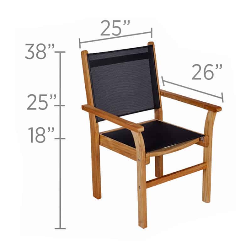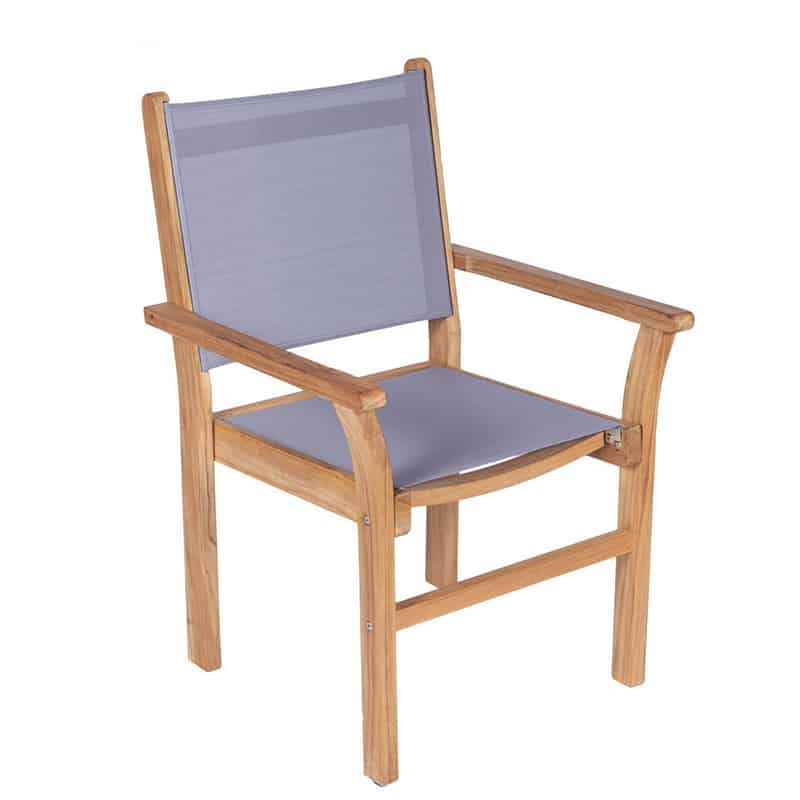 The Royal Teak Collection Captiva Sling Stacking Chair is a high-quality outdoor patio chair that’s sure to enhance your patio paradise. This chair is constructed from premium, all-natural plantation-harvested teak wood and promises to be long-lasting and durable while the high oil content naturally resists the outdoor elements. The wood is kiln-dried and machine-made, complete with mortise and tenon joints for a sturdy profile and comes with a comfortable sling seat and back for ideal rest and relaxation. The seat and back are made with a high-quality gray sling material that is quick-drying, making it ideal for use around beaches and pools. This vinyl-coated fabric can also sustain any type of climate without fading or deteriorating. These chairs can also be stacked, making storage when not in use a breeze. Teak is a very hard, dense wood that has a high oil content, which makes it naturally resistant to moisture, rot, shrinking, warping, splintering, insects and fungus. If left untreated, teak will naturally age to a beautiful silver-gray.