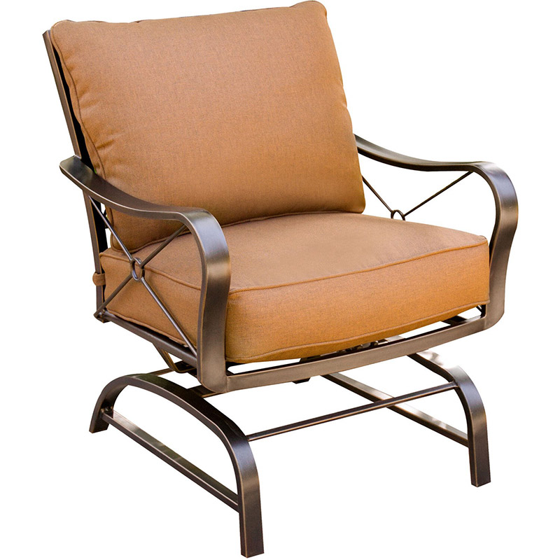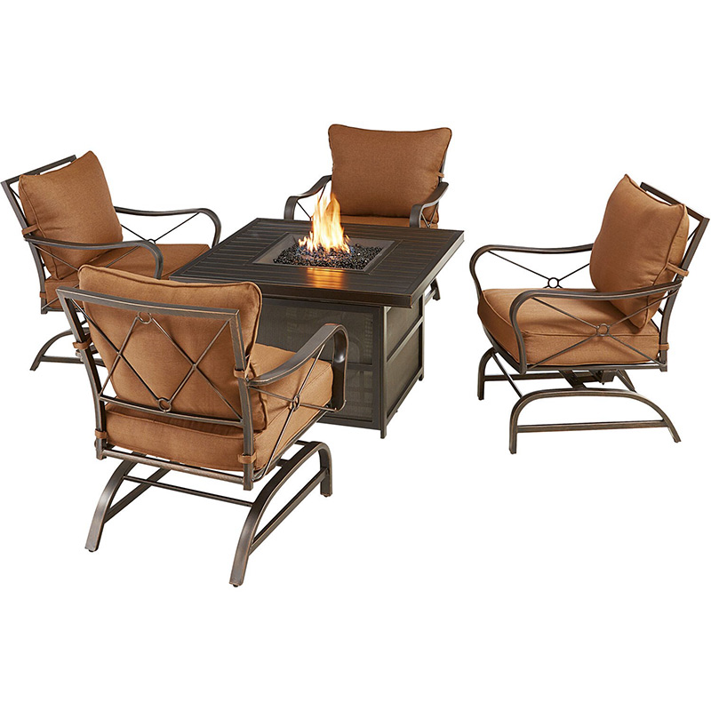 - Set includes: 4 Cushioned Rocking Chairs and choice of firepit