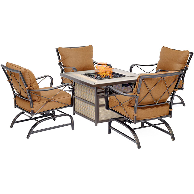 - COMFORTABLE WARM DESIGN: The Summer Nights Collection by Hanover includes four stylish and elegant oversize cushioned rocking chairs and 40″ stone-top fire pit. The 40,000 BTU fire pit accommodates a 20 lb. propane tank to warm up all your family and friends. Perfect addition to your patio, yard, deck, or porch.
